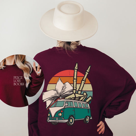 Peace Love Books Crewneck - Skeleton Hands Bookish Sweatshirt - Front and Back Print