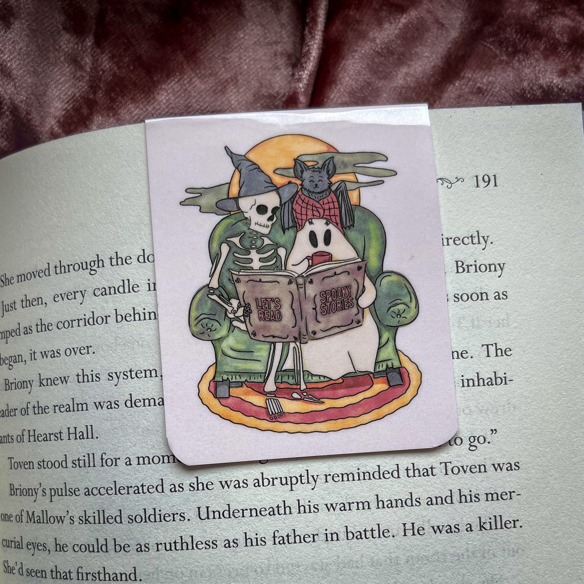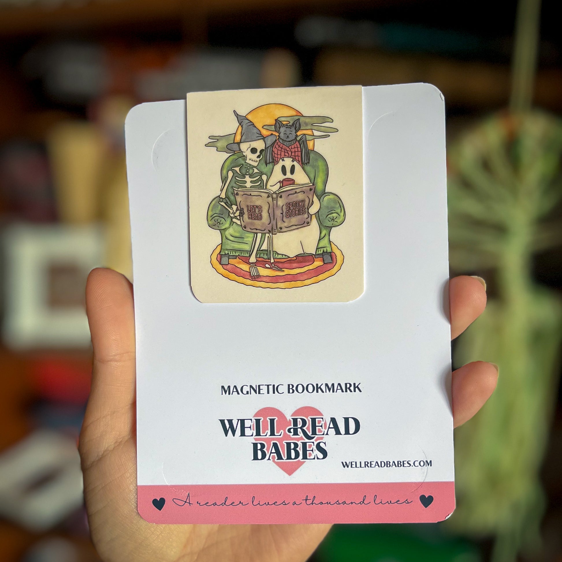A little bit spooky, a little bit charming, meet your new favorite bookmark: some cozy friends reading on the couch on Halloween. It’s gothic, it’s cozy, and it is a must-have for readers who love spooky season, romantasy, and dark academia vibes.