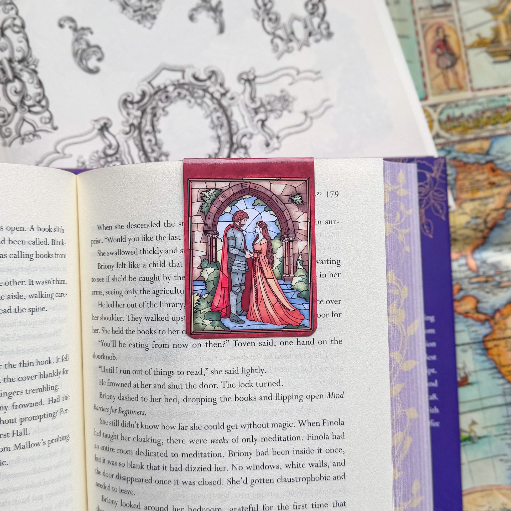 This stained glass style magnetic bookmark features a knight and lady standing beneath a gorgeous gothic cathedral arch, rendered in rich jewel tones that catch the light beautifully.