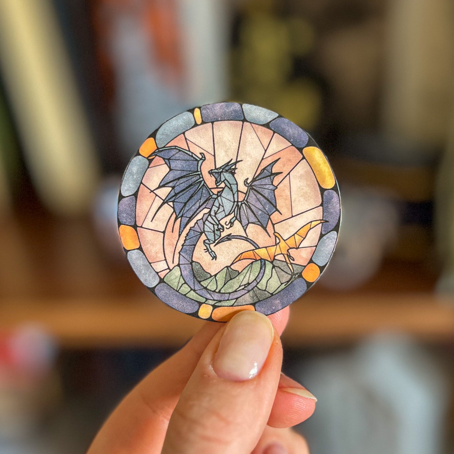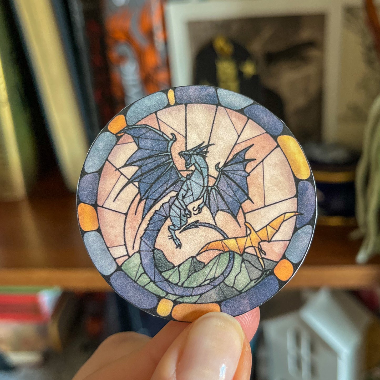 This vinyl sticker is water and scratch resistant and captures our favorite pair of dragons in a stained glass design. Get it for your kindle, book cart, water bottle, journal or mug. Or, surprise your book bestie! 🖤