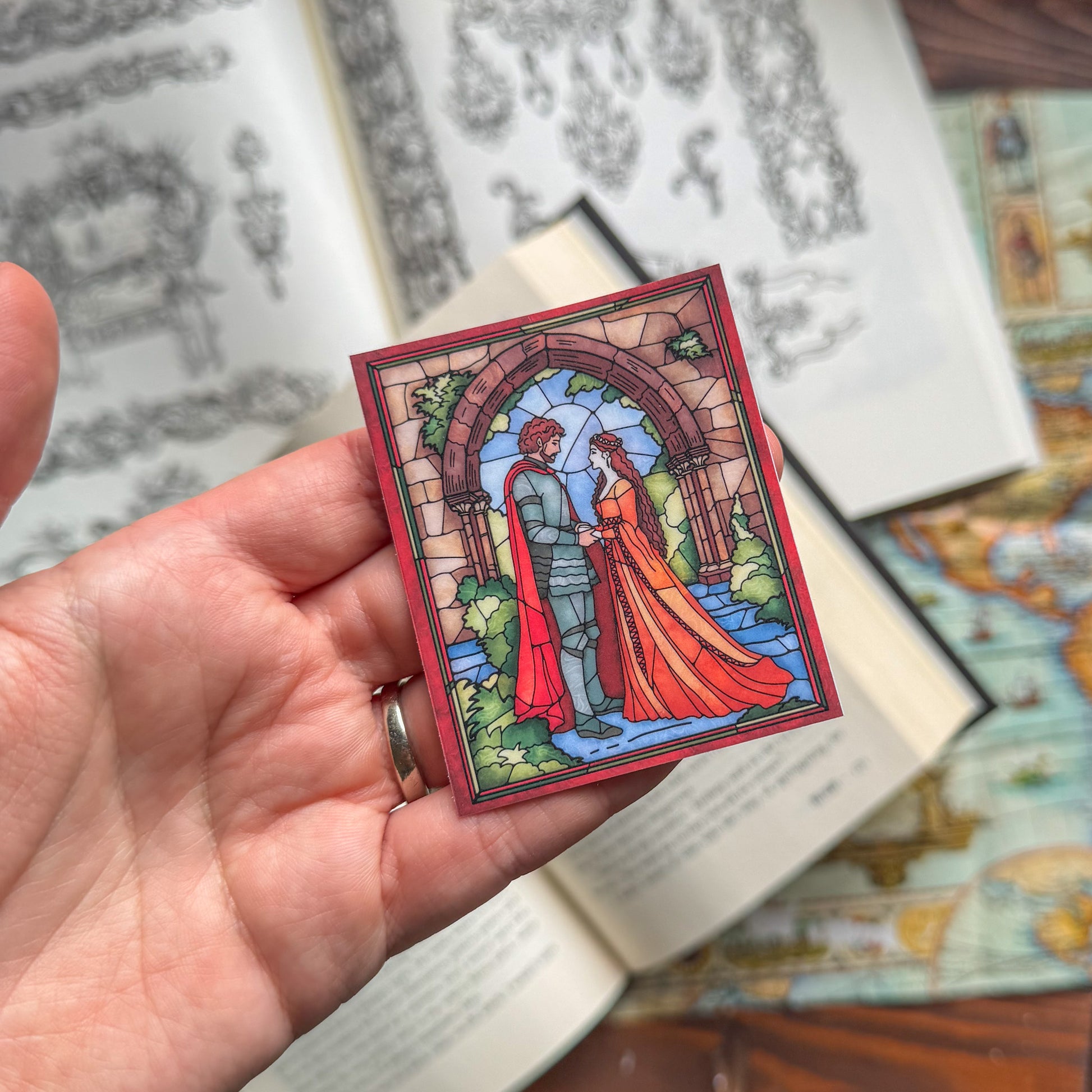 This stained glass style vinyl sticker features a knight and lady standing beneath a gothic stone arch, caught in a tender, storybook moment. The jewel-toned colors and leaded-glass details give it the feeling of a miniature cathedral window, - like a scene pulled from an old romance and pressed gently onto the page.