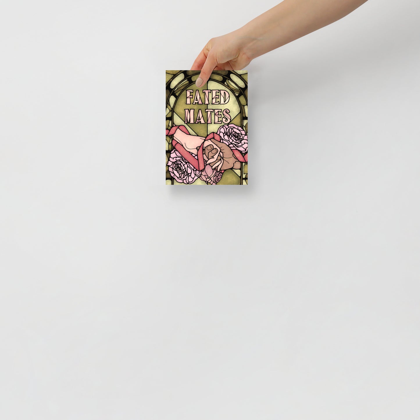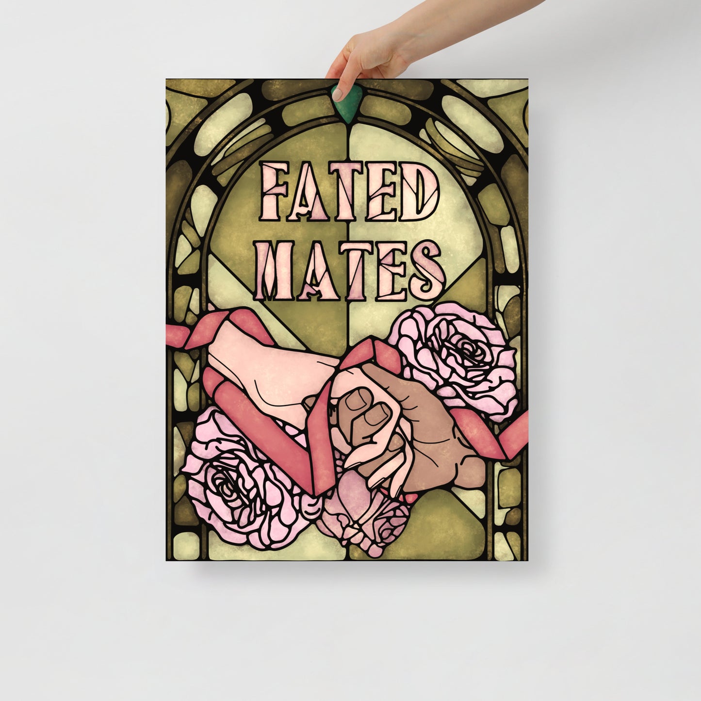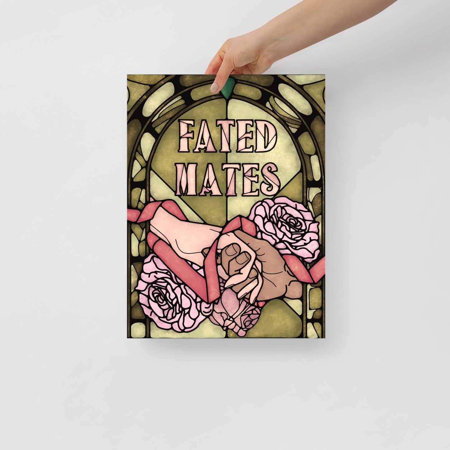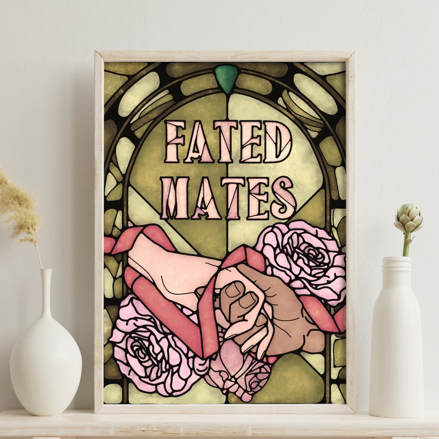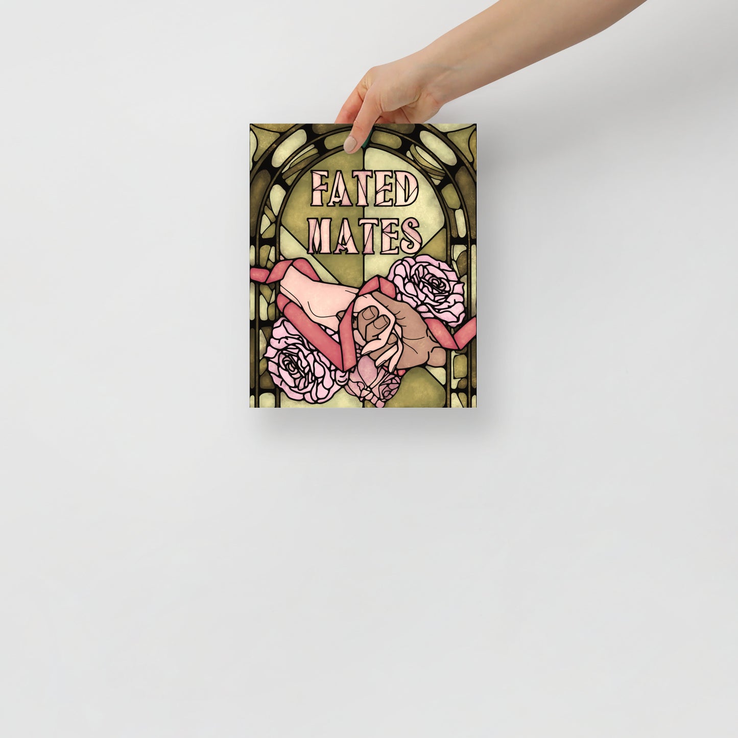 Printed on thick museum-quality matte paper, this art print captures a Fated Mates romantasy book trope in stained glass art style.