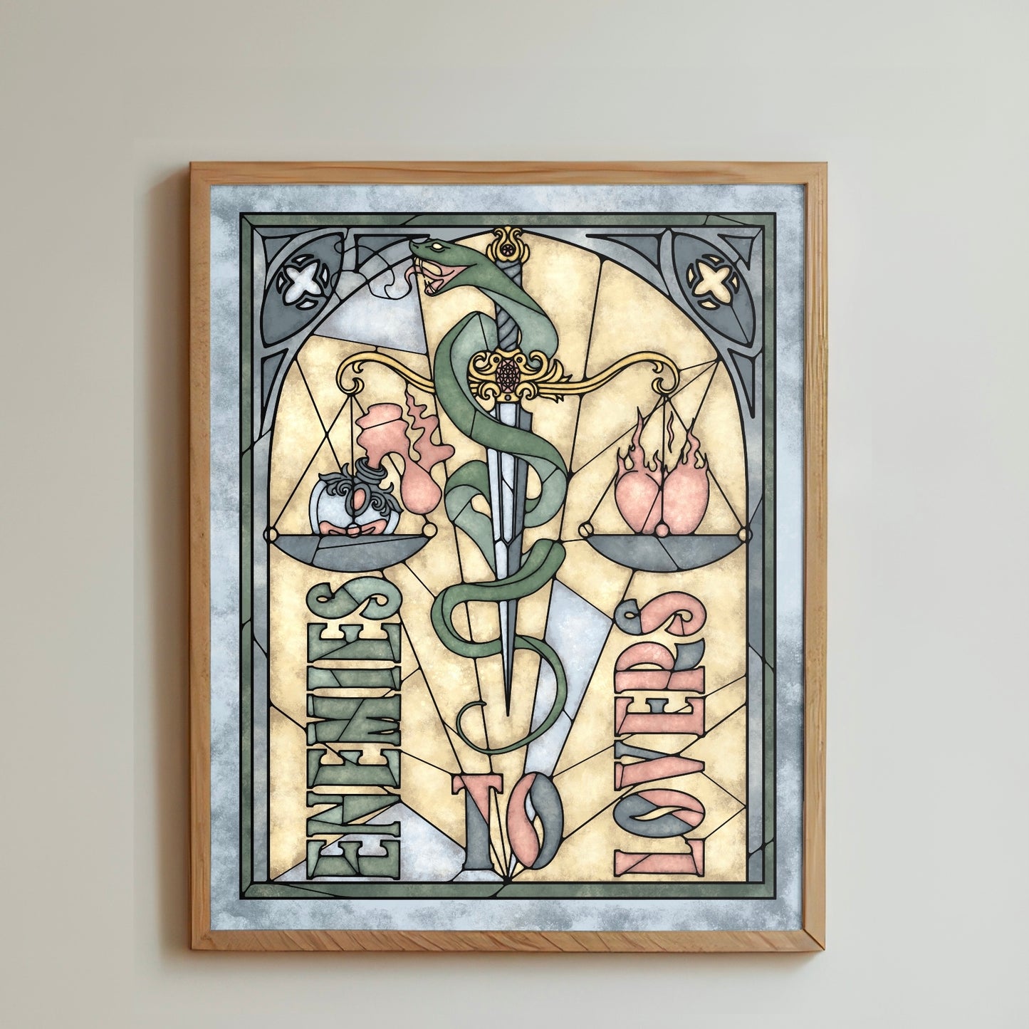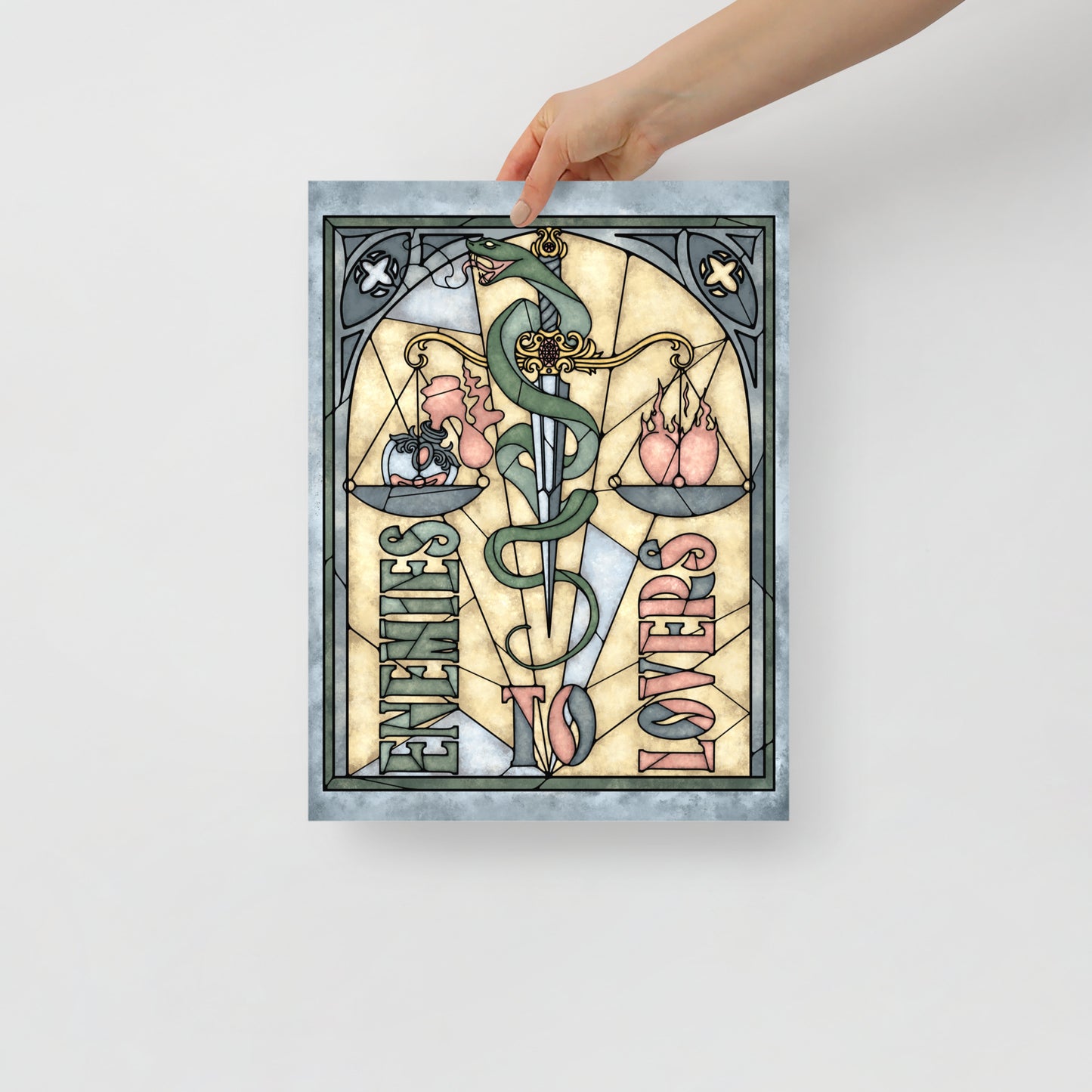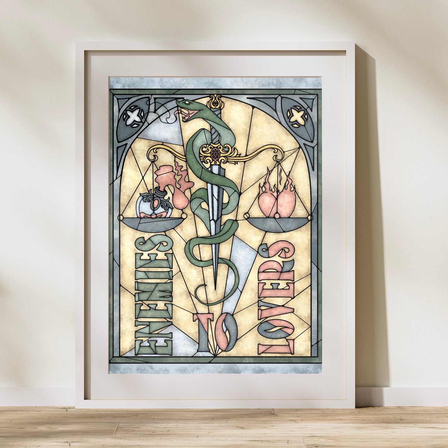Printed on thick museum-quality matte paper, this art print captures an Enemies To Lovers romantasy book trope in stained glass art style.