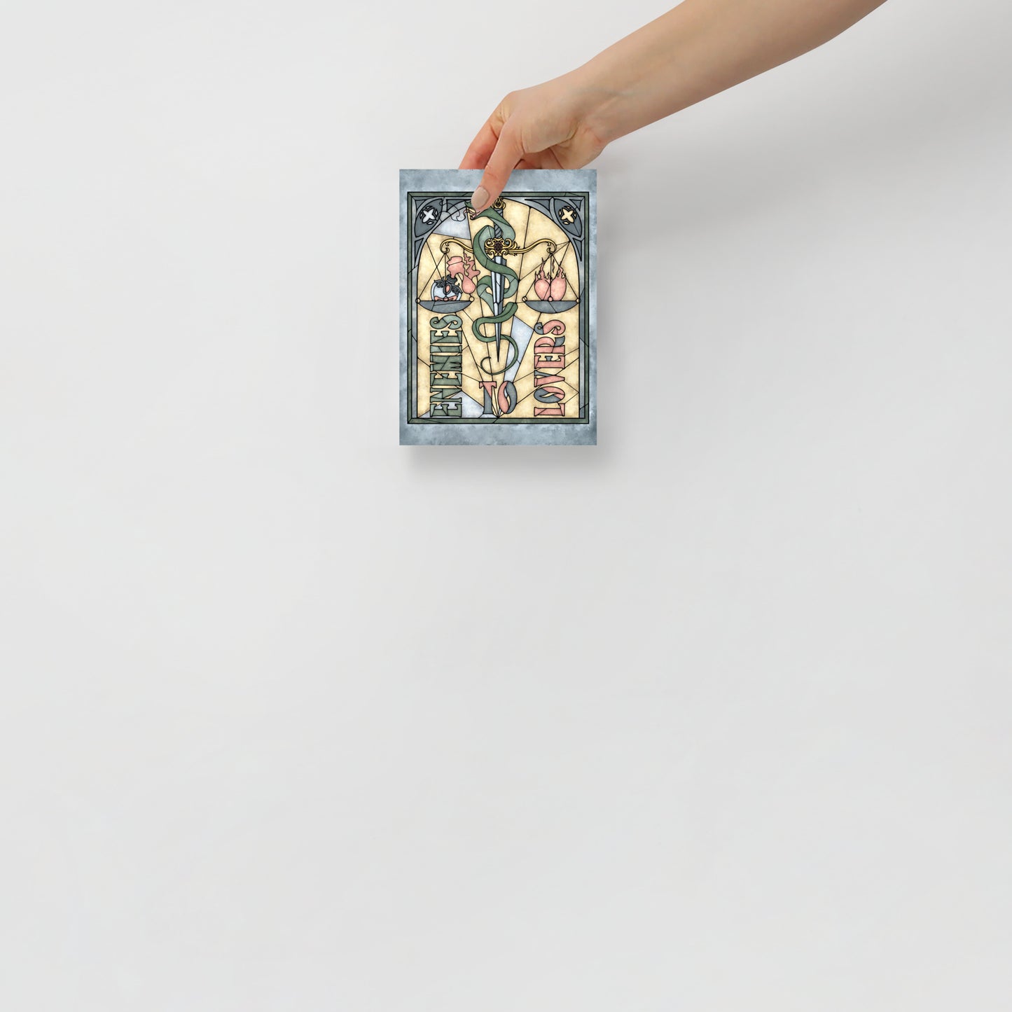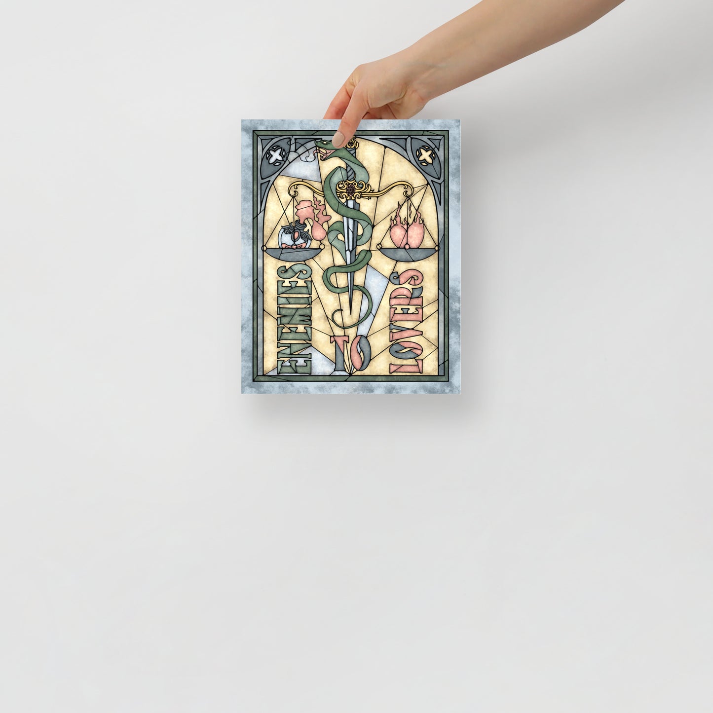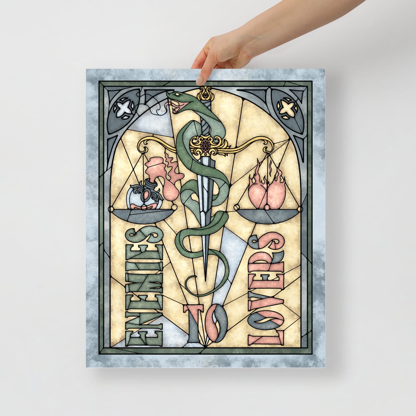 Printed on thick museum-quality matte paper, this art print captures an Enemies To Lovers romantasy book trope in stained glass art style.