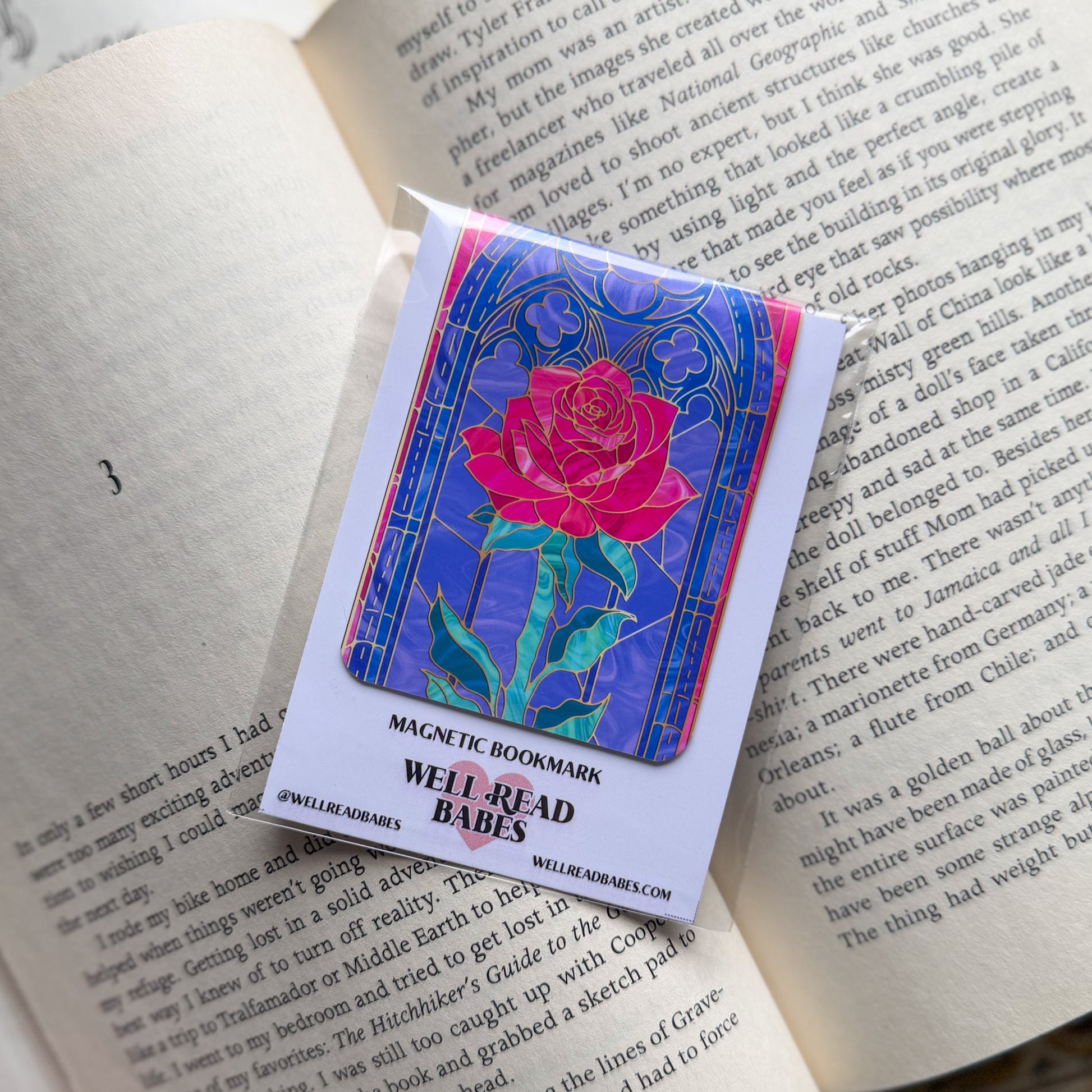 This stained glass style magnetic bookmark features an enchanted pink rose framed by a gothic cathedral window, inspired by fairytales, castle libraries, and medieval romance.