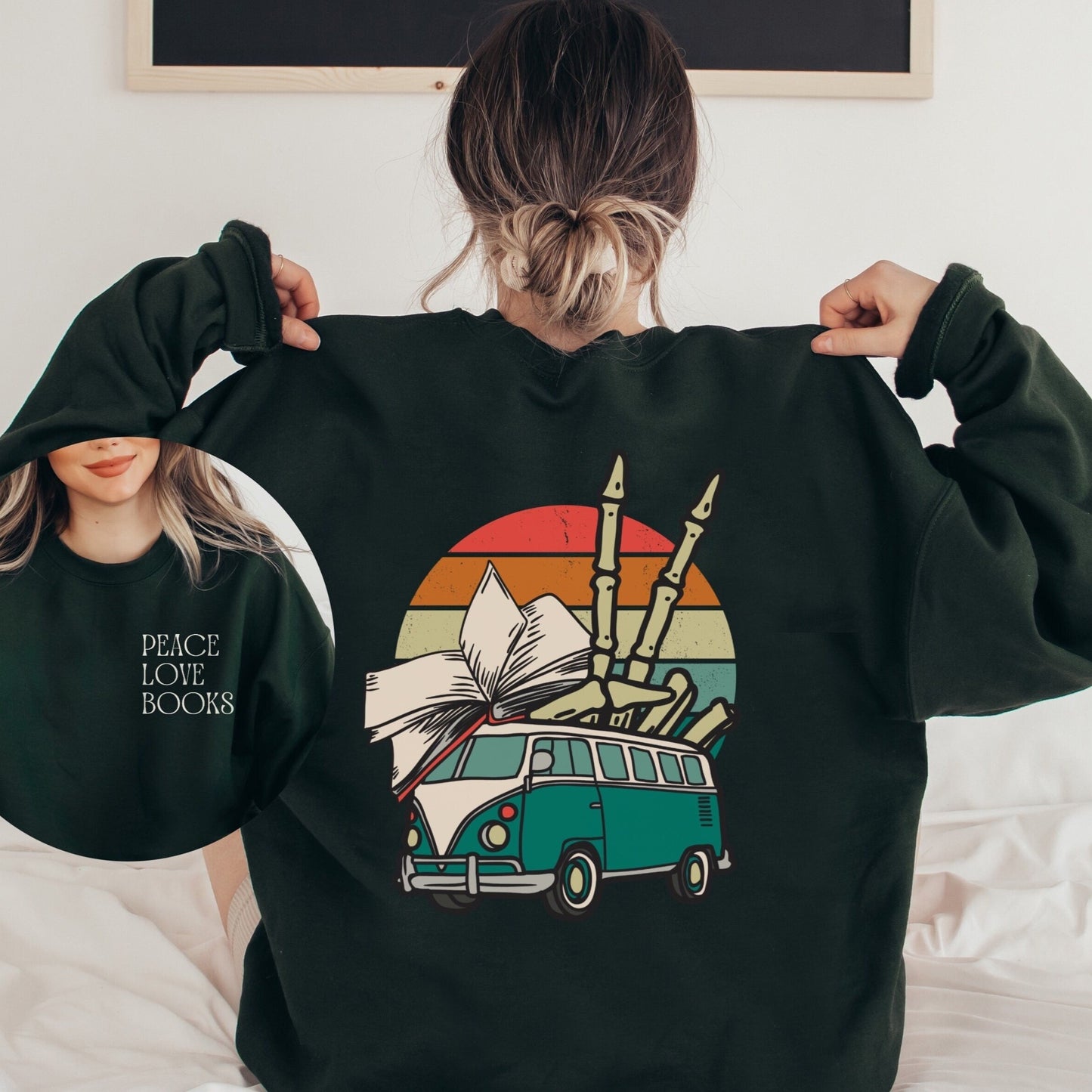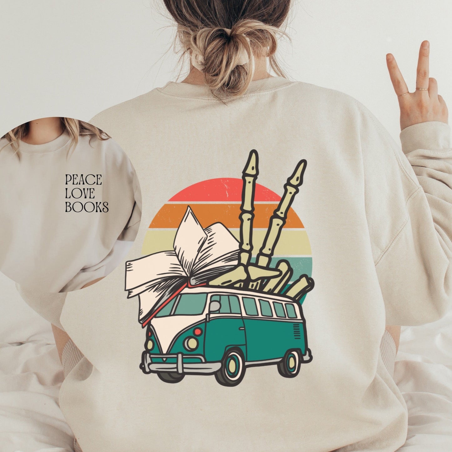 Peace Love Books Crewneck - Skeleton Hands Bookish Sweatshirt - Front and Back Print