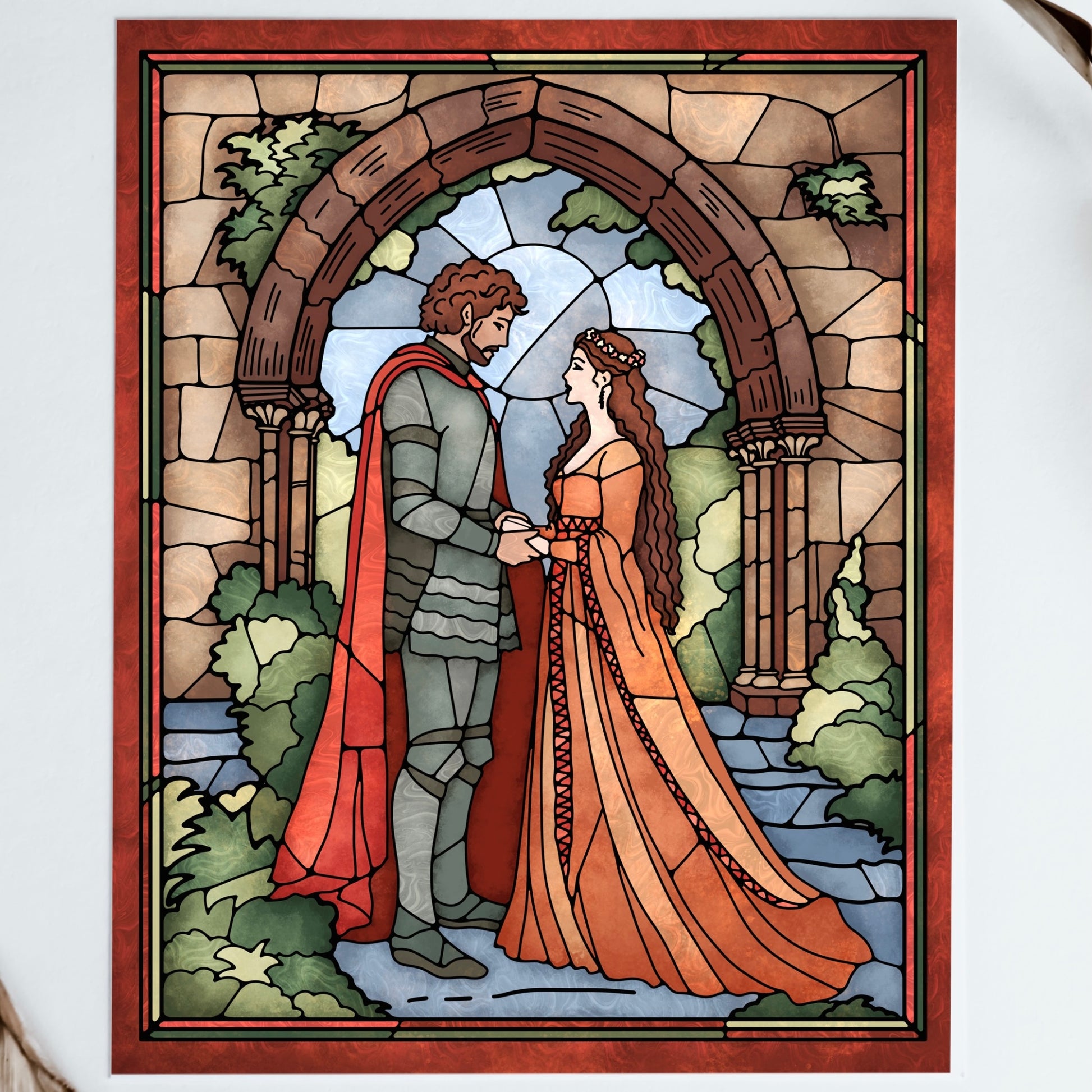 This stained glass style art print features a knight and lady beneath a gothic cathedral arch, capturing the quiet intimacy and timeless beauty of medieval romance. Warm terracotta, soft blues, and lush greenery bring depth and movement to the composition, from the knight’s flowing red cape to the lady’s elegant gown and the stone arch framing their moment together. The result is a romantic, story-driven piece that feels both classic and emotionally resonant.